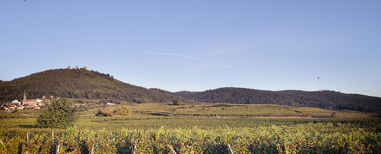 At the foot of the Stauffen mountains and the Three Castles of Eguisheim, the village of Husseren les Châteaux is the highest of the Alsatian vineyard, at an altitude of 390 meters. Next to the forest and above the vines, there is a view of the Rhine plain as far as to the Black Forest.